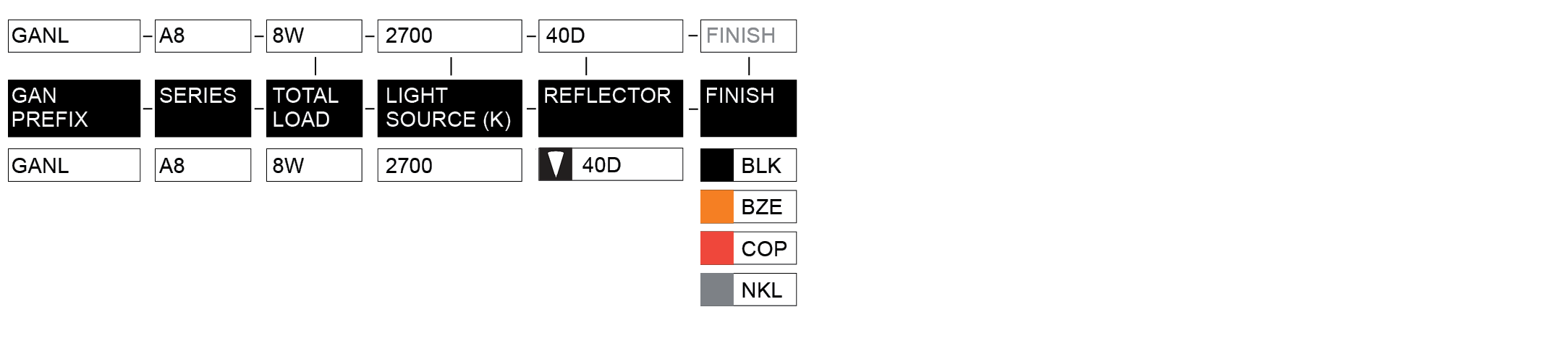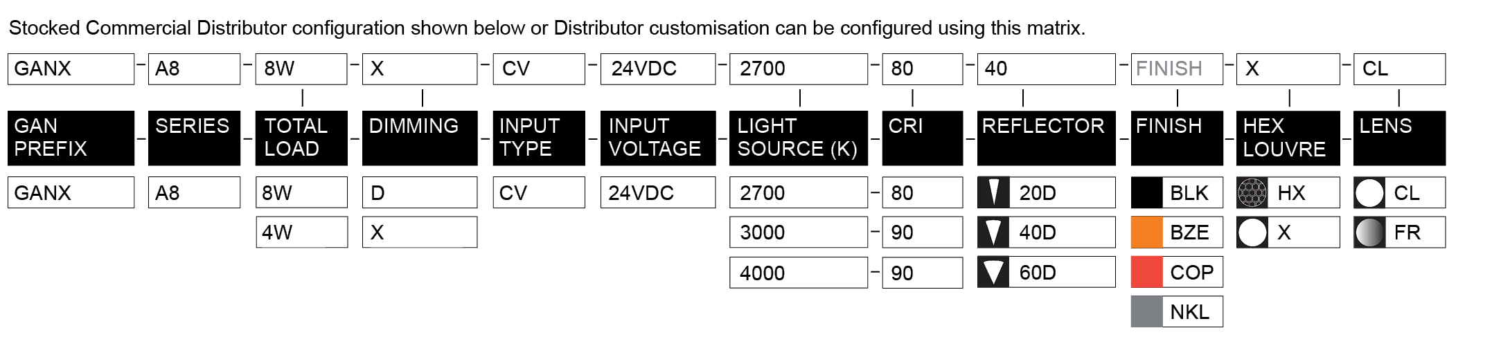 Designed to suit a variety of residential and landscaping applications the Standard range is readily available from your local Distributor. To identify your unique ordering code simply add your chosen finish to the end of the code matrix as shown below.