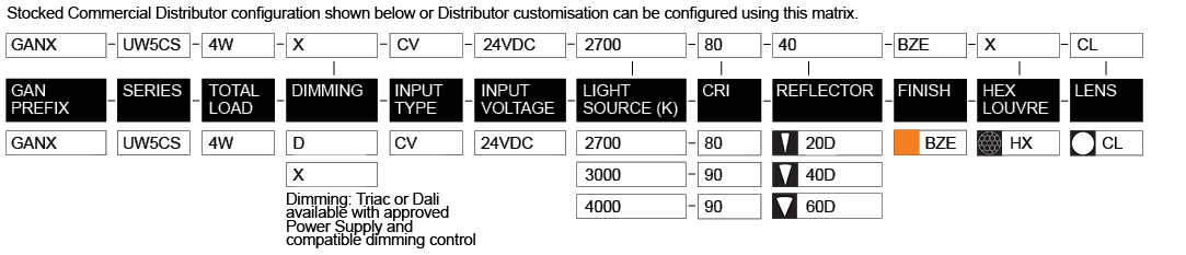 Designed to suit a variety of residential and landscaping applications the Standard range is readily available from your local Distributor. To identify your unique ordering code simply add your chosen finish to the end of the code matrix as shown below.
